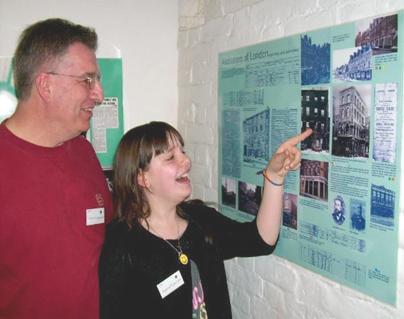 project-managed by Leaside Regeneration Ltd, and after much hard work the restoration is now complete. The chief executive of Leaside Regeneration, Paul Brickell, came across references to our Thomas while researching the history of Bromley Hall. He bought copies of Adrian Alabaster's and Tony Springall's books and was pleased to have his information confirmed. He invited Laraine and anyone else in the Alabaster Society to visit the Hall. And so it came to pass that, at precisely 2:30 pm on the afternoon of Thursday 14 February 2008, a deputation of loyal and stout members of said Society met at Bromley-by-Bow tube station. Laraine, Tony and Pam, Michael William and Peter walked along the busy, noisy and polluted A12, also known as the Blackwall Tunnel Northern Approach Road, towards Bromley Hall, delightfully situated about two metres from the southbound lane of the A12. On the way, we looked out for any surviving remnants of the original meadow but can report that, in this run-down area of East London, there are no stretches of open, broom-covered land to be seen. Paul was waiting to take us on a guided tour of the Hall. He is a very knowledgeable, enthusiastic and friendly person and was happy to answer all our questions. As we entered the Hall unobserved through the back door, we realised that we were almost certainly the first members of the Alabaster family to visit the house for 405 years. Many original features were discovered during the building work. These were conserved and can now be viewed. We saw a recently uncovered 15th-century carved oak door frame with a hunting scene (a hound chasing a deer), the remains of a stone-encased spiral staircase, wood wall beams and brickwork, wall paintings, and more. We ended the tour in what was the Main Hall and now serves as the boardroom for Leaside Regeneration. It is called the Blount Room. Set into the floorboards is a glass panel through which can be seen a brick-arched cellar from the original 12th-century house. Also in this room are the remains of a 15th-century wall painting. It appears to be the back view of a man holding a bow and wearing a Tudor hat. Sadly, his right hip and leg have been amputated by the insertion of a Georgian fireplace. Above this, a Tudor window has been bricked up, and supporting the ceiling there is an impressive array of heavy oak beams. Looking out of the window we could see a constant stream of speeding, polluting traffic only two or three metres away. Thomas would have had a landscape of broom-covered meadow with marshy bits here and there, a little-used track leading into London, and fresh air. I think he had the better deal.